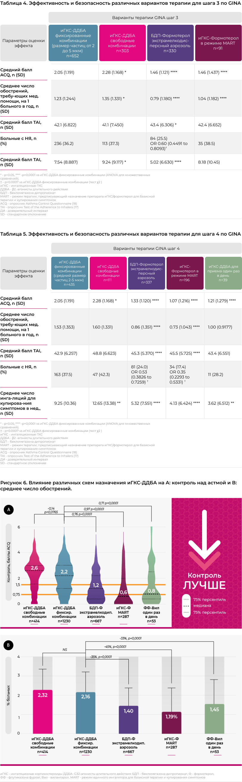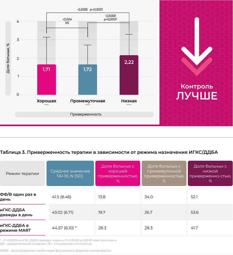 Оценка контроля над астмой по опроснику ACQ-5 показала, что среди участников исследования преобладали больные с неконтролируемой астмой - 56%. Контролируемая и частично контролируемая астма диагностирована у 21% и 19%, соотвественно. Еще у 4% больных отмечалась тяжелая неконтролируемая астма. Более чем у половины больных (53.6%) опросник TAI выявил низкий уровень приверженности к терапии. Доля пациентов с контролируемой астмой и средняя частота обострений в год были достоверно ниже в подгруппах пациентов, получавших терапию экстрамелкодисперсной комбинацией ИГКС/ДДБА и комбинацией ИГКС/формотерол в режиме единого ингалятора, по сравнению с базисной терапией фиксированными и свободными комбинациями ИГКС и ДДБА.
