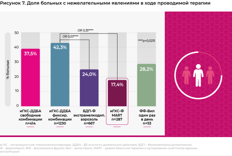 Нежелательные эффекты иГКС-содержащей терапии были зарегистрированы у 31,7% больных общей популяции исследования (среди пациентов на 5-м шаге терапии - в 38% случаев). Максимальная частота возникновения нежелательных явлений отмечалась у пациентов, получавших наиболее распространенные препараты для лечения среднетяжелой и тяжелой астмы, - фиксированные комбинации иГКС/ДДБА в форме дозированных аэрозольных ингаляторов и порошковых ингаляторов с масс-медианным размером частиц в диапазон от 2 до 5 мкм (нежелательные явления отмечались у 42,3% пациентов этой группы) и свободные комбинации иГКС и ДДБА (37,5% пациентов). Однако использование более современных лекарственных препаратов и режимов терапии позволяло улучшить переносимость терапии. Так, при использовании фиксированной комбинации иГКС/ДДБА, применяемой один раз в день, 28,2% пациентов отмечали возникновение нежелательных явлений. При использовании иГКС/ДДБА в форме экстрамелкодисперсного аэрозоля, нежелательные явления отмечались на 40-47% реже, по сравнению с пациентами, получавшими комбинированные препараты в виде обычных дозированных аэрозолей и порошковых ингаляторов, и эта разница была достоверной. Наилучшая переносимость отмечалась в подгруппе пациентов, получавших комбинацию иГКС/ДДБА в режиме MART: доля пациентов, испытывавших нежелательные явления на фоне терапии единым ингалятором, была наименьшей среди всех пациентов исследования (рисунок 7).