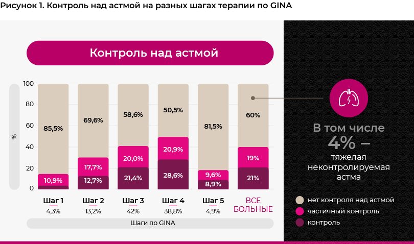 Минимальная доля больных с контролируемой астмой (3.6%) была выявлена среди больных, не получавших иГКС (GINA шаг 1). Затем по мере увеличения объема терапии доля больных с контролем над астмой увеличивается до 28.6% на 4 шаге по GINA 2019. Однако, на 5-м шаге терапии доля больных с контролируемой астмой снижается до 8.9% (см. рисунок 1).