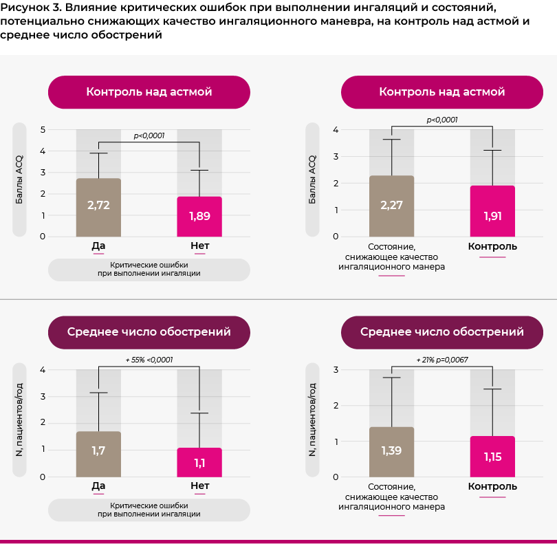 По мнению исследователей, из числа больных, включенных в исследование, 7.3% пациентов совершали ингаляции с критическими ошибками. Ср. число обострений в этой группе больных оказалось на 55% выше, чем у пациентов, адекватно выполнявших ингаляционный маневр (RR 1.55; P<0.0001). Такие больные также имели клинически и статистически достоверно более низкий уровень контроля над астмой по шкале ACQ (Δ 0.83 балла; P<0.0001). Кроме того, у 15% больных имелись заболевания и состояния, которые потенциально могли отрицательно повлиять на выполнение ингаляционного маневра (тремор, нарушение мелкой моторики, артриты суставов кисти, сниженное зрение, проблемы с запоминанием и т.п.). Больные с такими состояниями также достоверно хуже контролировали заболевание (см. рисунок 3).