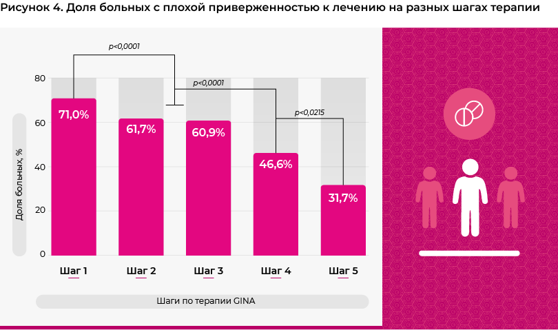 Самая высокая доля больных с низкой приверженностью к лечению отмечалась на 1-м шаге терапии по GINA - 71.0%, по мере увеличения объема терапии число некомплаентных пациентов снижалось так, что на пятом шаге только 31.7% больных имели низкие показатели приверженности по TAI (см. рисунок 4).