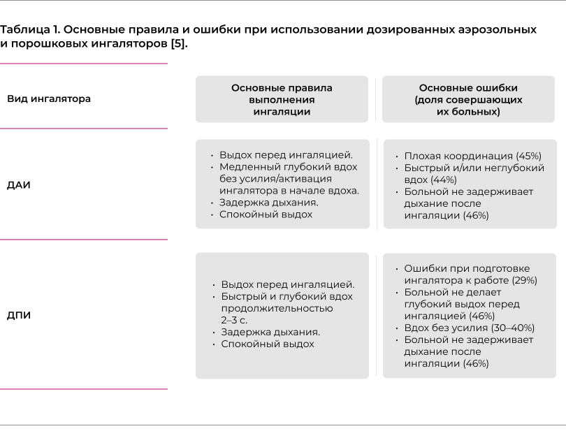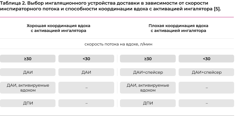 Главными критериями выбора ингаляционного устройства доставки при наличии навыков его правильного использования и необходимого ЛС в составе являются показатели скорости инспираторного потока и способность координации вдоха с активацией ингалятора (табл. 1, 2). Рекомендуется использовать только один тип ингалятора для всех назначенных больному ингаляционных ЛС. Это упрощает обучение больного и снижает вероятность ошибок. Выбор ингалятора для введения лекарственного препарата является ключевым фактором клинической эффективности любой ингаляционной терапии и при стабильной БА должен основываться на предпочтении пациента и оценке правильности использования. Врач должен быть уверен, что пациент сможет и будет правильно использовать назначенный ингалятор.