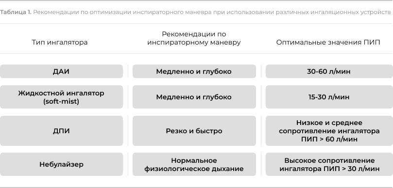 Для большинства ДПИ значение ПИП не менее 60 л/мин считается оптимальным для адекватной легочной депозиции препарата, в то время как ПИП менее 30 л/мин не позволяет лекарственному препарату достичь нижних отделов респираторного тракта2,4,22,30. При этом клиническая эффективность ДПИ при значении ПИП от 30 до 60 л/мин может быть недостаточна, поэтому при значении ПИП менее 60 л/мин предпочтительнее использовать аэрозольные ингаляторы6,11,24 (Табл. 1).
