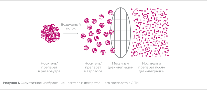 ДПИ используют лекарственное вещество в сухом виде (порошок), которое с помощью энергии вдоха пациента достигает его дыхательных путей. Функционирование всех известных ДПИ зависит от инспираторного усилия пациента, необходимого для того, чтобы «поднять» дозу препарата из резервуара (капсулы, блистера). Кроме того, в большинстве ДПИ частицы лекарственного препарата находятся в соединении с носителем – моногидратом лактозы, и инспираторный поток нужен для дезагрегации порошка и отделения лекарственных частиц от носителя (Рис. 1)39.